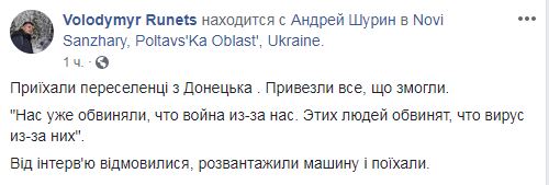 "Приехали переселенцы из Донецка. Привезли все, что смогли. "Нас уже обвиняли, что война из-за нас. Этих людей обвинят, что вирус из-за них". От интервью отказались, разгрузили машину и поехали", - написал он.