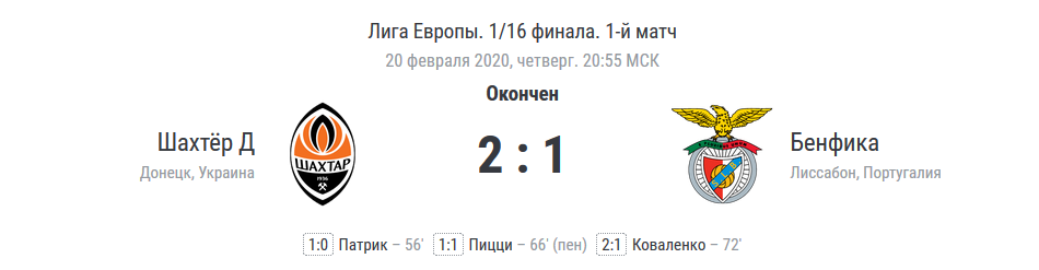 Вчера, 20 февраля, внимание всех мировых агентств и СМИ было приковано к первым матчам плей-офф Лиги Европы. В России же особенно следили за парой Шахтер - Бенфика. Все дело в том, что португальцы в этом сезоне лишили питерский Зенит еврокубков, обыграв их со счетом 3:0 в решающем матче группового этапа Лиги чемпионов.