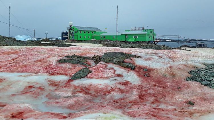 Малиновый снег вокруг антарктической станции имени Вернадского. Фото: facebook.com