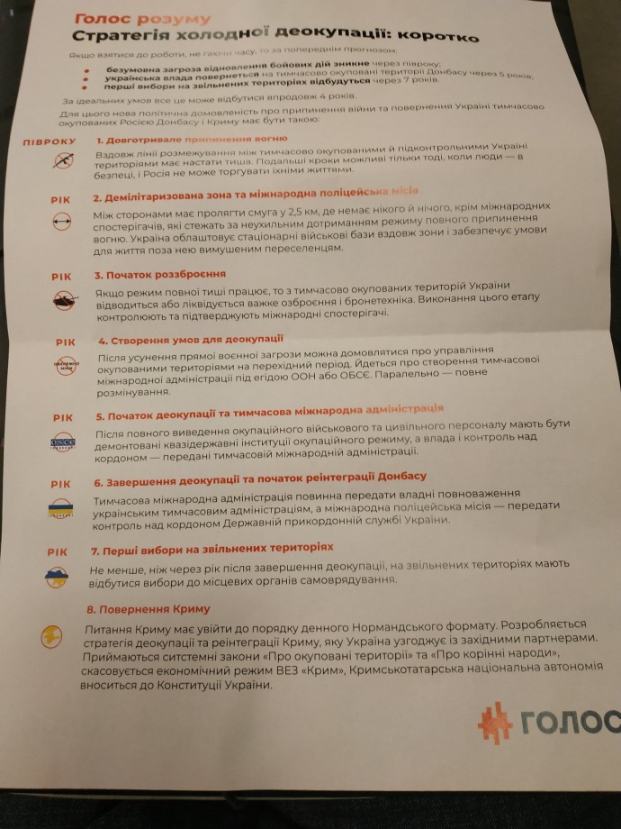 Это следует из трансляция партии "Голос" с презентации и краткий план "Голос разума: стратегия холодной деоккупации оккупированных районов Донбасса и Крыма".