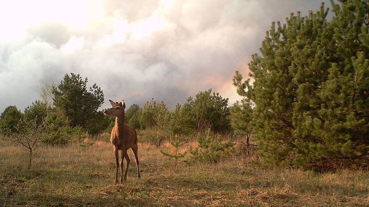 Встревоженный олень на фоне дыма от лесных подаров. Фото: Facebook/ zapovidnyk2018