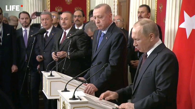 Владимир Путин и Реджеп Тайип Эрдоган подвели итоги двусторонних переговоров, которые состоялись в Москве 5 марта. Лидеры России и Турции наедине больше шести часов обсуждали обострение конфликта на Ближнем Востоке и способы его урегулирования.