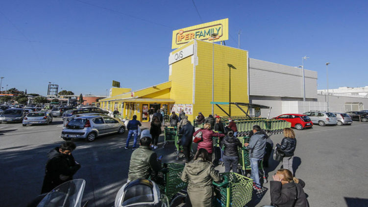 Люди стоят в очереди снаружи супермаркета в Риме, чтобы соблюсти необходимую дистанцию друг от друга. Фото: Fabio Frustaci / EPA / ТАСС