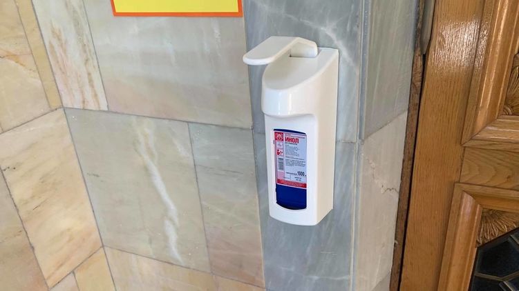 В пятницу, 13 марта, на входе в Верховную Раду Украины начали проверять температуру у всех входящих в здание парламента. Так же здесь проводят мероприятия по дезинфекции, на стене повесили устройство с антисептиком.
