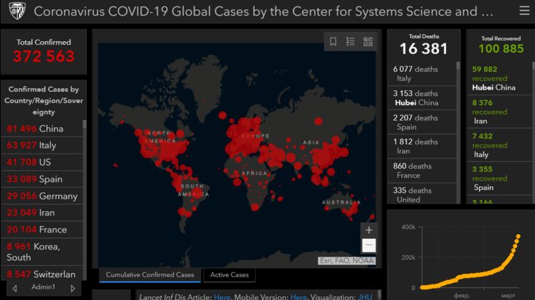 Всего в мире к 23 марта зарегистрированы 372 563 случая заболевания коронавирусом.