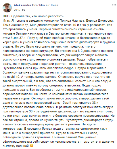 16:15 Киевлянка Александра Бречко Киевлянка рассказала, как у нее проявился коронавирус. По ее словам, симптомы могут быть практически незаметными и в этом опасность заболевания. "Опасность вируса не в том, что он такой смертельный, а в том, что его симптомы незаметные и его поздно диагностируют, именно потому смертность высокая. Люди поздно приходят к врачу. Вся проблема в том, что инфицированный человек переживает болезнь на ногах не замечая этих мелких симптомов типа першение в горле. Он ходит, занимается спортом, а вирус делает свое дело и потом в один прекрасный день - бам!!! температура 38 и двустороннее восполнение легких". - написала она.
