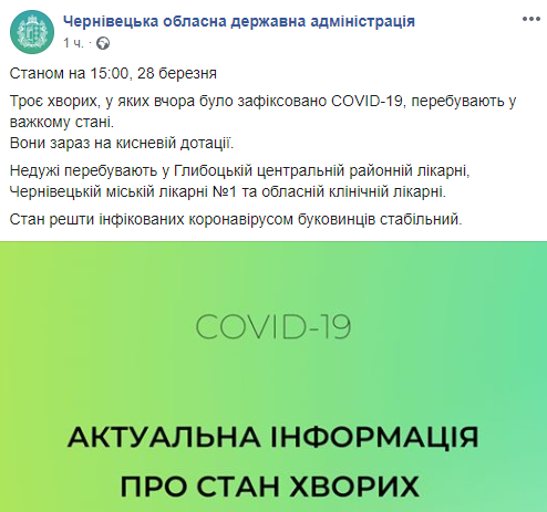 16:42 В Черновицкой ОГА сообщают, что по состоянию на 28 марта на 15:00 в области 59 случаев инфицирования Covid-19. То есть еще плюс 12 случаев.