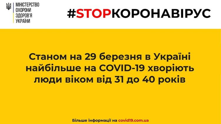 Министерство охраны здоровья Украины привело статистику больных коронавирусом по возрастным группам. По состоянию на 29 марта в Украине COVID-19 больше всего болеют люди в возрасте от 31 года до 40 лет.