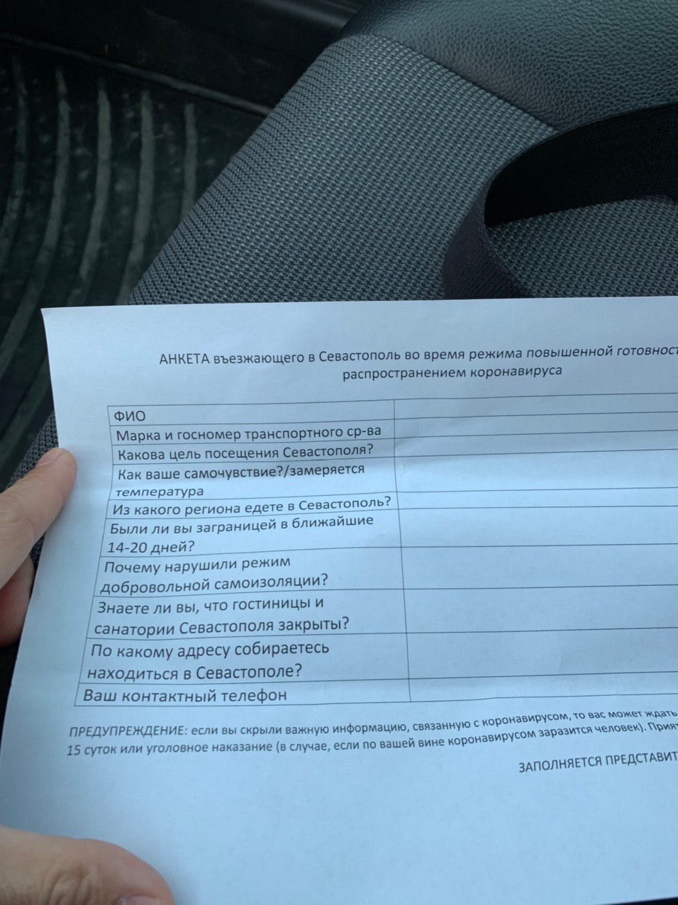 13:26 Севастополь развернул пункты пропуска на подъезде к городу. Все въезжающие автомобили в целях недопущения распространения коронавируса, люди заполняют анкету.