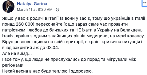 "Если у вас есть родственники в Италии (а они у вас есть, потому что украинцев в Италии более 260 000), убедите их, что сейчас самое время проявить патриотизм и любовь к близким и НЕ ехать в Украину на Пасху. Италия, страна с одним из самых высоких уровней медицины, на грани коллапса. Вирус распространился по всей территории, в стране критическая ситуация и въезд закрыт до 03.04. Но не выезд", - пишет львовянка Наталья Гарина.