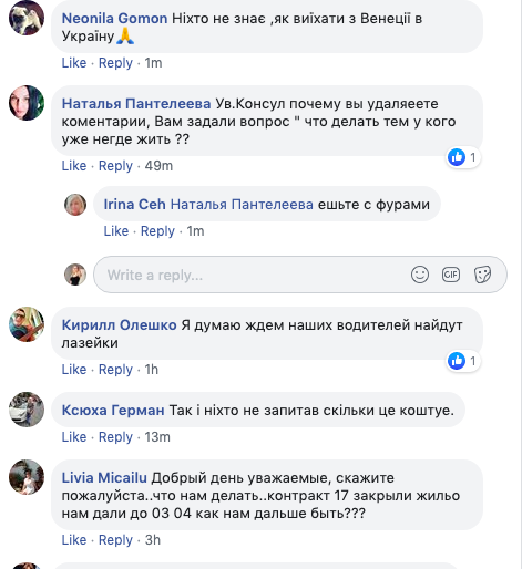 "Никто не знает, как выехать из Венеции в Украину?", - пишет Неонила Гомон.