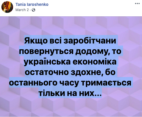 "Если все заробитчане вернутся домой, то украинская экономика окончательно сдохнет, потому что последнее время держится только на них", - пишет Тоня Ярошенко.