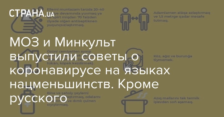 "В рамках информационной кампании противодействия распространению коронавирусной инфекции МОЗ Украины разрабатывает материалы для разных групп населения. Совместно с Министерством культуры и информационной политики Украины коммуникационная команда "Коронавирус_инфо" адаптировала базовые рекомендации о мерах на языках национальных меньшинств, проживающих на территории страны. Сейчас инфографика уже доступна на польском, крымскотатарском, венгерском и румынском языках", - сообщила пресс-служба ведомства.