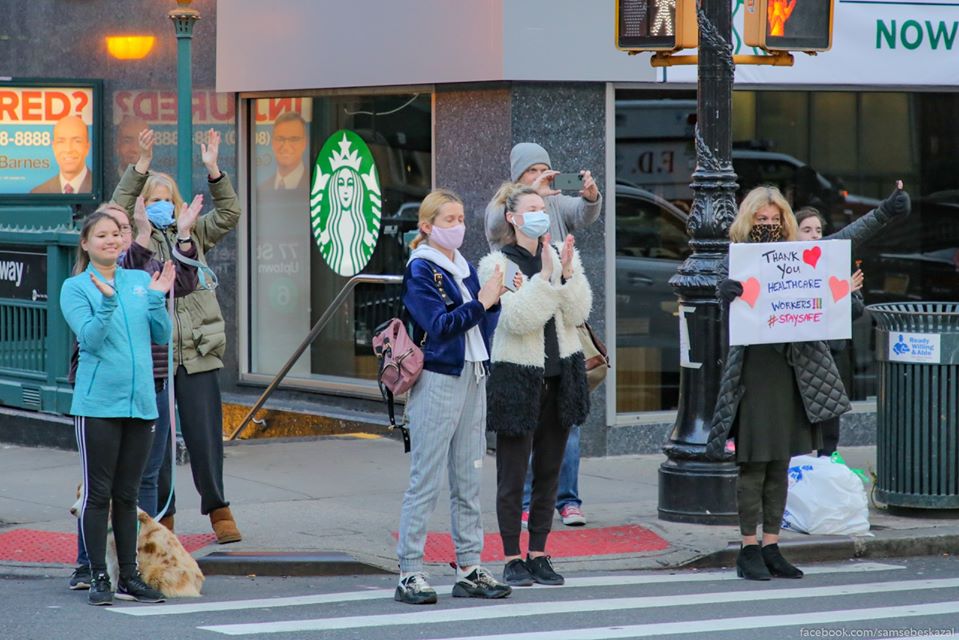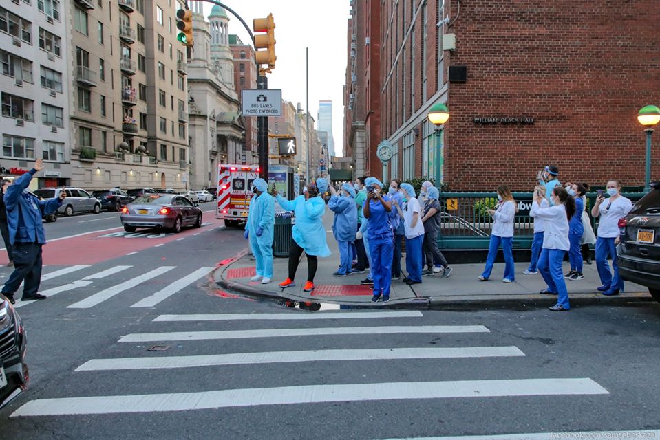21:44 Русскоязычный гид в Нью-Йорке опубликовал в Facebook фото, сделанные у госпиталя Ленокс-Хилл на Манхэттене. По его словам, каждый день в семь вечера медики, которые могут покинуть передовую выходят на улицу перед госпиталем и получают свою заслуженную минуту славы. Нью-Йоркцы долго аплодируют и кричат "спасибо!", а проезжающие мимо машины останавливаются и гудят.