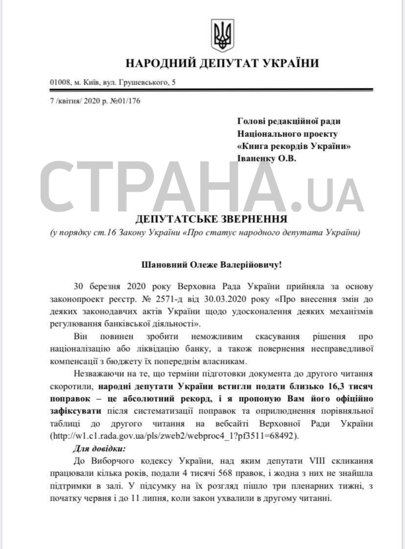 "Несмотря на то, что срок подготовки документа ко второму чтению сократили, народные депутаты Украины успели падать около 16,3 тыс. поправок - это абсолютный рекорд, и я предлагаю вам его официально зафиксировать после систематизации поправок и обнародования сравнительной таблицы ко второму чтению на сайте ВРУ", - говорится в документе.
