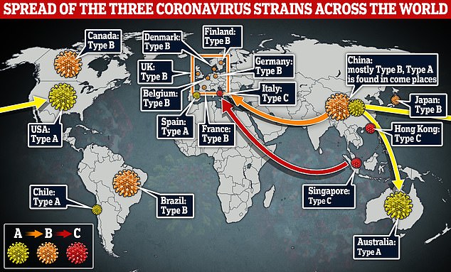 Условно они выделили три типа - А. В и С. Тип А - это исходный вирус, который передался людям от летучих мышей. Другие два типа - это его мутации.