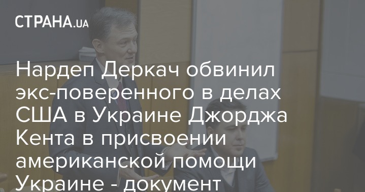 Внефракционный народный депутат Украины Андрей Деркач написал заявление в Офис генерального прокурора по факту мошеннического освоения выделенных США средств материальной помощи Украине, к которому, по его мнению, причастен бывший временный поверенный в делах США в Украине Джордж Кент, которого называют куратором антикоррупционных органов в Украине.
