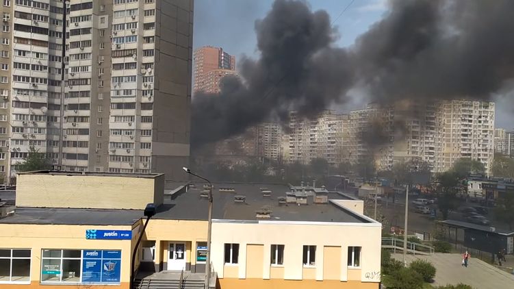 В Киеве загорелся ресторан. Над многоэтажками стоит столб черного дыма. Скриншот из видео
