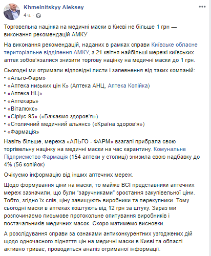 17:27 Крупнейшие сети аптек в Киеве снизят торговую наценку на медицинские маски до 1 грн. Об этом сообщил глава Киевского областного территориального отделения Антимонопольного комитета Украины Алексей Хмельницкий. По его словам, аптеки сообщили, что подняли цены из-за роста закупочной цены, которую якобы завысили производители и перекупщики. Поэтому сегодня маски в аптеках стоят от 12 грн за штуку. Так ли это - предстоит выяснить.