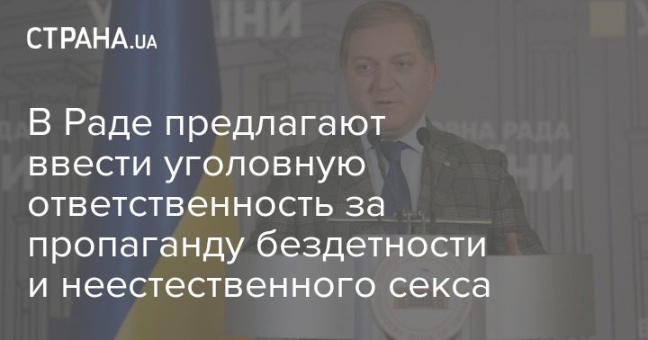 Народный депутат Олег Волошин ("Оппозиционная платформа - За жизнь!) подал в Раду проект о внесении изменений в Уголовный кодекс относительно установления уголовной ответственности за публичные призывы и (или) пропаганду отказа от рождения детей, разрушения института семьи, внебрачных и неестественных сексуальных отношений и разврата.