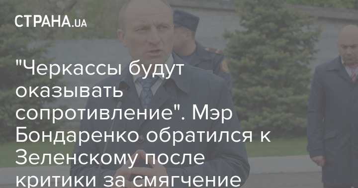 Мэр Черкасс Анатолий Бондаренко, который заявил об угрозах из Офиса президента за смягчение карантина, предупредил президента Украины Владимира Зеленского, что город будет оказывать сопротивление в случае преследования за решение смягчить карантин.