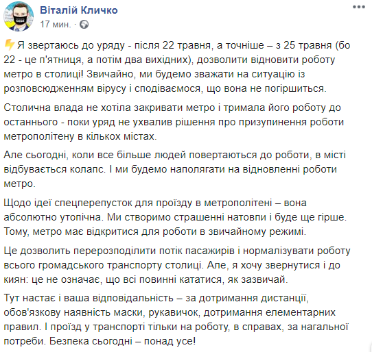 12:40 Кличко просит открыть метро в Киеве с 25 мая