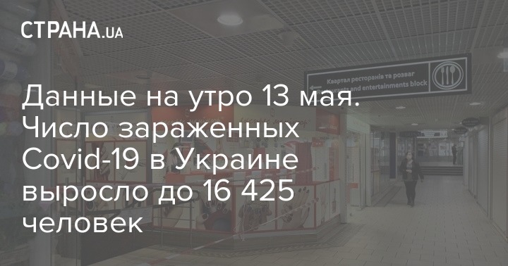 По данным ЦОЗ, по состоянию на 09:00 13 мая в Украине 16 425 лабораторно подтвержденных случаев Covid-19, из них 439 летальных, 3 716 пациентов выздоровели. За сутки зафиксировано 402 новых случая.