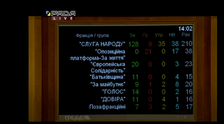 14:03 Голосование по фракциям: Слуга народа 128, ЕС - 20, Батькивщина 11, За будущее 9, голос 14, доверие 11, внефракционные 7