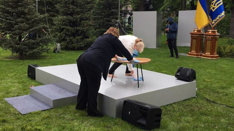 Утром в среду, 20 мая, перед пресс-конференцией Владимира Зеленского в Киеве пошел дождь. Мероприятие проходило под открытым небом, поэтому стул и сцена, подготовленные для главы государства, промокли. Перед появлением президента их сушили, в том числе при помощи фена.