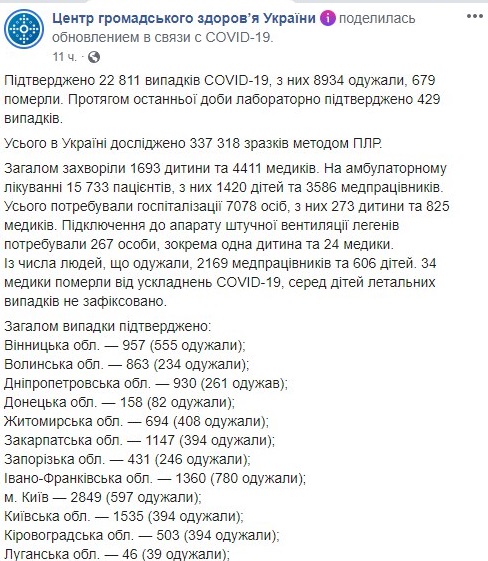 "Подтверждено 22 811 случаев COVID-19, из них 8934 выздоровели, 679 умерли. За последние сутки лабораторно подтверждено 429 случаев. На амбулаторном лечении находится 15 733 пациентов. Всего нуждались в госпитализации 7 078 человек. Подключение к аппарату искусственной вентиляции легких потребовалось 267 людям", - указано в сообщении.