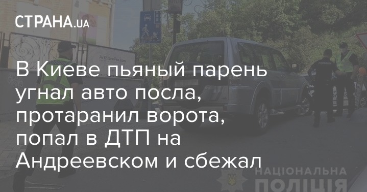 В Киеве пьяный 21-летний молодой человек проник в резиденцию посла иностранного государства и, украв ключи от внедорожника, протаранил ворота, после чего попал в ДТП на Андреевском спуске. Злоумышленника поймали через несколько минут и по факту происшествия начали уголовное производство.