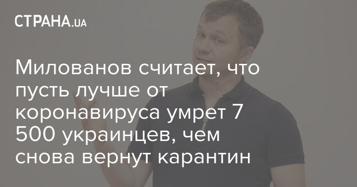 Экс-министр экономического развития, торговли и сельского хозяйства Украины, руководитель "Киевской школы экономики" Тимофей Милованов заявил, что в Украине до конца года от коронавируса умрет 7 500 человек, если не вернуть карантинные ограничения в стране. Но, несмотря на это, он надеется, что "у политиков хватит мужества и воли не возвращать карантин".