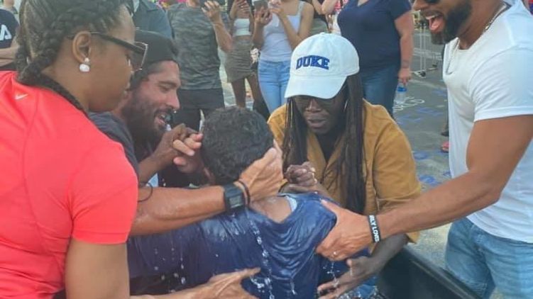 На месте смерти Джорджа Флойда чернокожие пасторы уже начали крестить людей. Фото: Twitter / MarlowCF