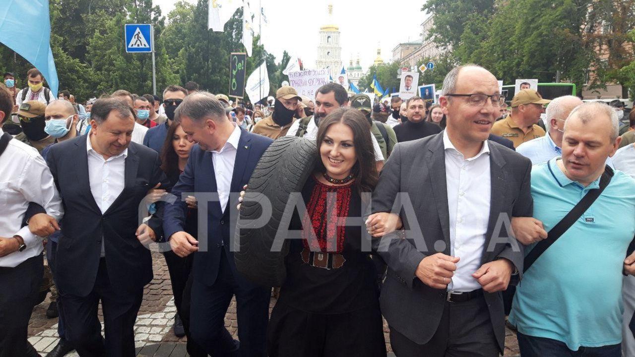 Тем временем толпа уже дошла до здания ОП. На ступенях Офиса выстроились депутаты ЕС, толпа скандирует "Зелю геть" и "Слуга виходь - народ прийшов".