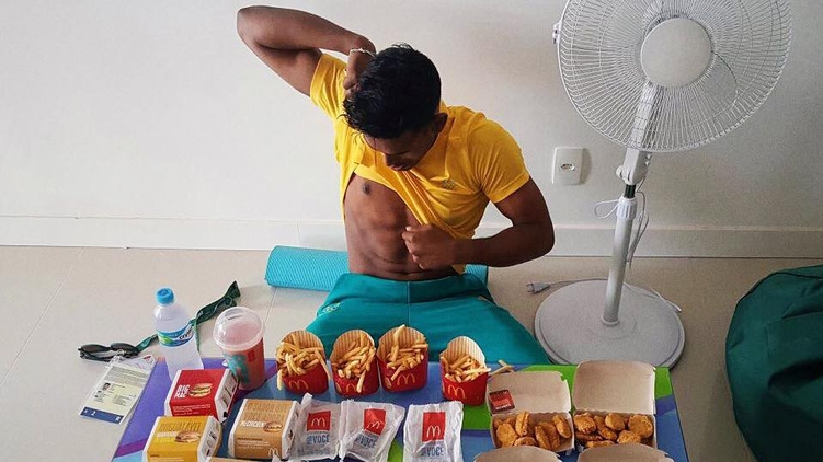Судя по фотографии, бадминтонист съел шесть бургеров, шесть больших пачек картошки фри, шесть десертов брауни и 40 наггетсов.
