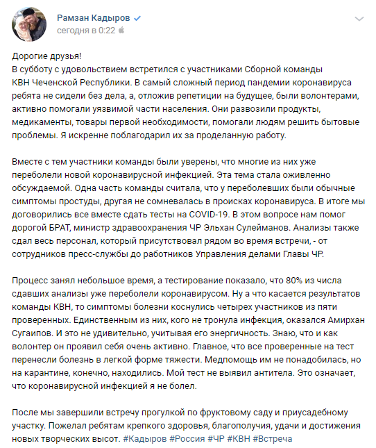 "Мой тест не выявил антитела. Это означает, что коронавирусной инфекцией я не болел", - пишет лидер Чечни.
