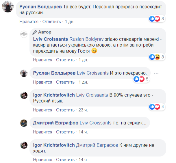 После мовного скандала с украинской сетью McDonald's, которая отказалась предоставлять свои услуги клиентам на русском языке, с аналогичной позицией выступила сеть ресторанов "Львовские круассаны".