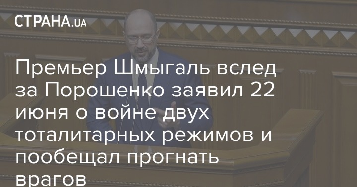 Премьер-министр Украины Денис Шмыгаль в понедельник, 22 июня, в 79-ю годовщину нападения нацистской Германии на СССР также как и Петр Порошенко заявил о войне "двух тоталитарных режимов".