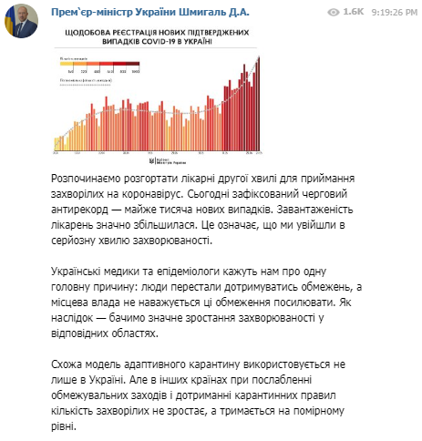 "Начинаем разворачивать больницы второй волны для приема больных с коронавирусом. Сегодня зафиксирован очередной антирекорд - почти тысяча новых случаев. Загруженность больниц значительно увеличилось. Это значит, что мы вошли в серьезную волну заболеваемости", - заявил Шмыгаль.