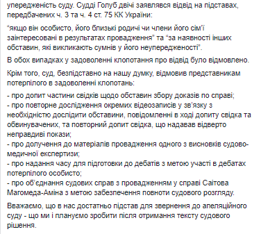 "Сегодня, 30.06.2020 года состоялось провозглашение приговора в судебном деле по обвинению Темербулатова Умолта Руслановича, Саитова Ахмеда Абубакаровича, Саитова Магомеда-Салиха Арбуевича по ч. 2 ст. 296 УК Украины (хулиганство. Совершенное группой лиц).