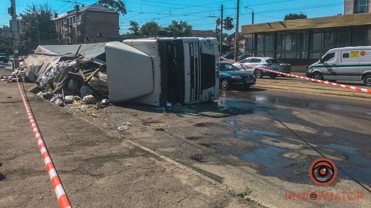 В Днепре груженая пивом фура на огромной скорости не вписалась в крутой поворот и легла на бок, лишь чудом не подмяв под себя други транспортные средства. ДТП произошло на проспекте Нигояна и попало на видео.