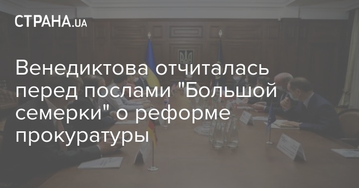 В понедельник, 6 июля, в Офисе генерального прокурора прошла встреча генпрокурора Ирины Венедиктовой с послами стран "Большой семерки" и Европейского Союза. На встрече генпрокурор рассказала иностранным гостям о ходе реформы прокуратуры и аттестации прокуроров.
