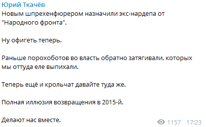 "Новым шпрехенфюрером назначили экс-нардепа от "Народного фронта". Ну офигеть теперь. Раньше порохоботов во власть обратно затягивали, которых мы оттуда еле выпихали. Теперь еще и крольчат давайте туда же.