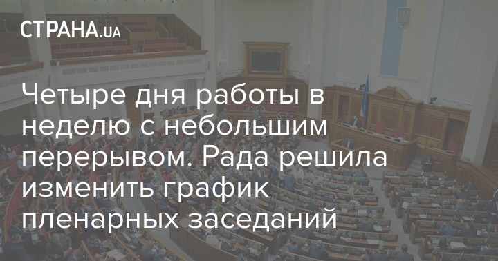 Так, согласно законопроекту №3608 "О внесении изменений в Регламент Верховной Рады Украины относительно графика проведения пленарных заседаний", на пленарной неделе заседания парламента во вторник, среду и четверг проводятся с 10:00 до 15:00, а в пятницу с 10:00 до 16:00 с перерывом с 12:00 до 12:30.