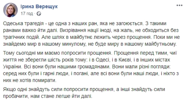 Также она стала одной из немногих, кто посочувствовал жертвам трагедии 2 мая в Одессе и призвала попросить у них прощения - в том числе и у сторонников Антимайдана.