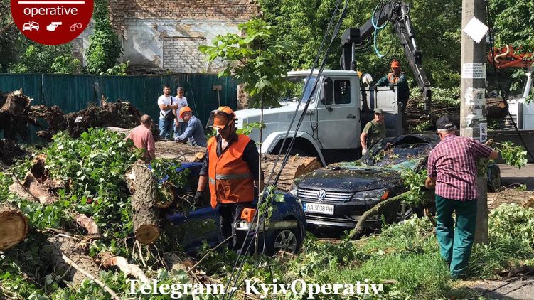 Так, деревья попадали на припаркованные рядом машины и ограждения на улицах Металистов, Лютеранской и Полевой. Также затопило улицу Борщаговскую и Василенко.