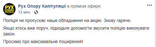 18:00 За час до начала  "Рух Опору Капітуляції" сообщил, что полиция не пропускает оборудование на акцию.