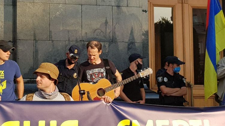 Под Офисом президента Владимира Зеленского в Киеве проходит митинг "Европейской солидарности" против перемирия на Донбассе. Один из его участников призвал собравшихся спеть гимн Украины, после чего включили фонограмму "Марша украинских националистов" - официального гимна ОУН.