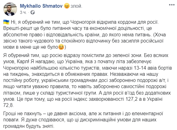 "Я возмущен тем, что Россию сразу поместили в зеленую зону. Без всяких условий, Карл! Я напомню, что Украина, которая с начала лета обеспечивает Черногорию наибольшим количеством туристов, имея сейчас 13-14 авиабортов в неделю, находится в ограниченных правах. Несмотря на нашу постоянную работу, украинским гражданам до сих пор запрещены путешествия а/т, и если читать внимательно правила, то даже запрещены самостоятельные путешествия самолетом, только в составе туристической группы. А для России въезд без дополнительных условий", - написал он на своей странице в Facebook.
