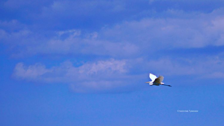 В Чернобыльском заповеднике показали большую белую цаплю, которая приняла S-образное положение шеи на период полета.